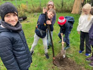 das schöne Wetter. Die Kinder wanderten nach Schöndelt, pflanzten an geeigneter Stelle und unter fachkundiger Anleitung von Frau Schmies ihre amerikanische Roteiche ein, genossen eine schöne