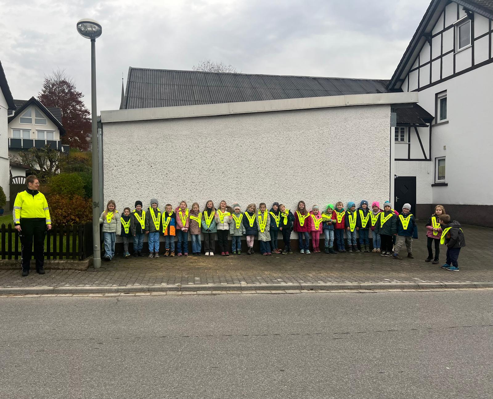 Heute (31.10 25) waren die Erstklässler mit der Polizistin Frau Lauer im Dorf unterwegs.