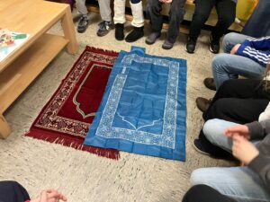 Außerdem zeigte Frau Koç zwei Gebetsteppiche, u.a. einen Gebetsteppich to go für die Schule, den sie mittels einer App nach Mekka ausrichten kann.