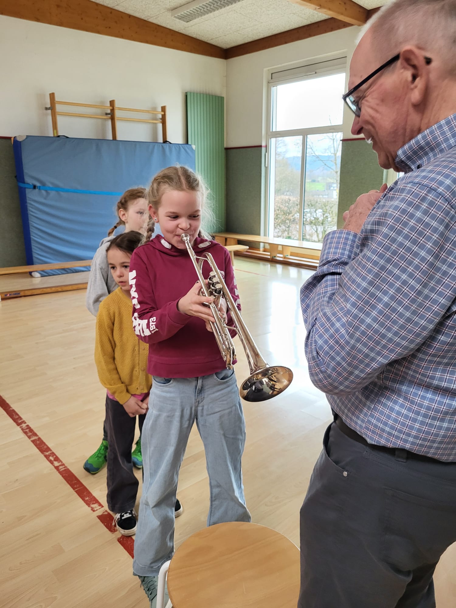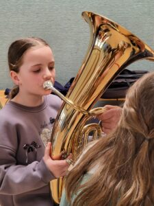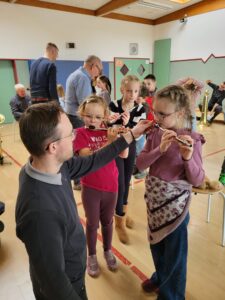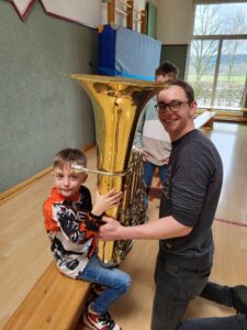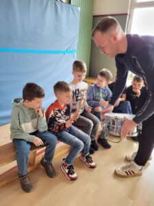 Wir durften die Instrumente sogar selbst ausprobieren. Das hat allen Kindern großen Spaß gemacht! Viele waren so begeistert, dass sie noch eine zweite Runde gemacht haben, um die Instrumente noch einmal zu spielen.