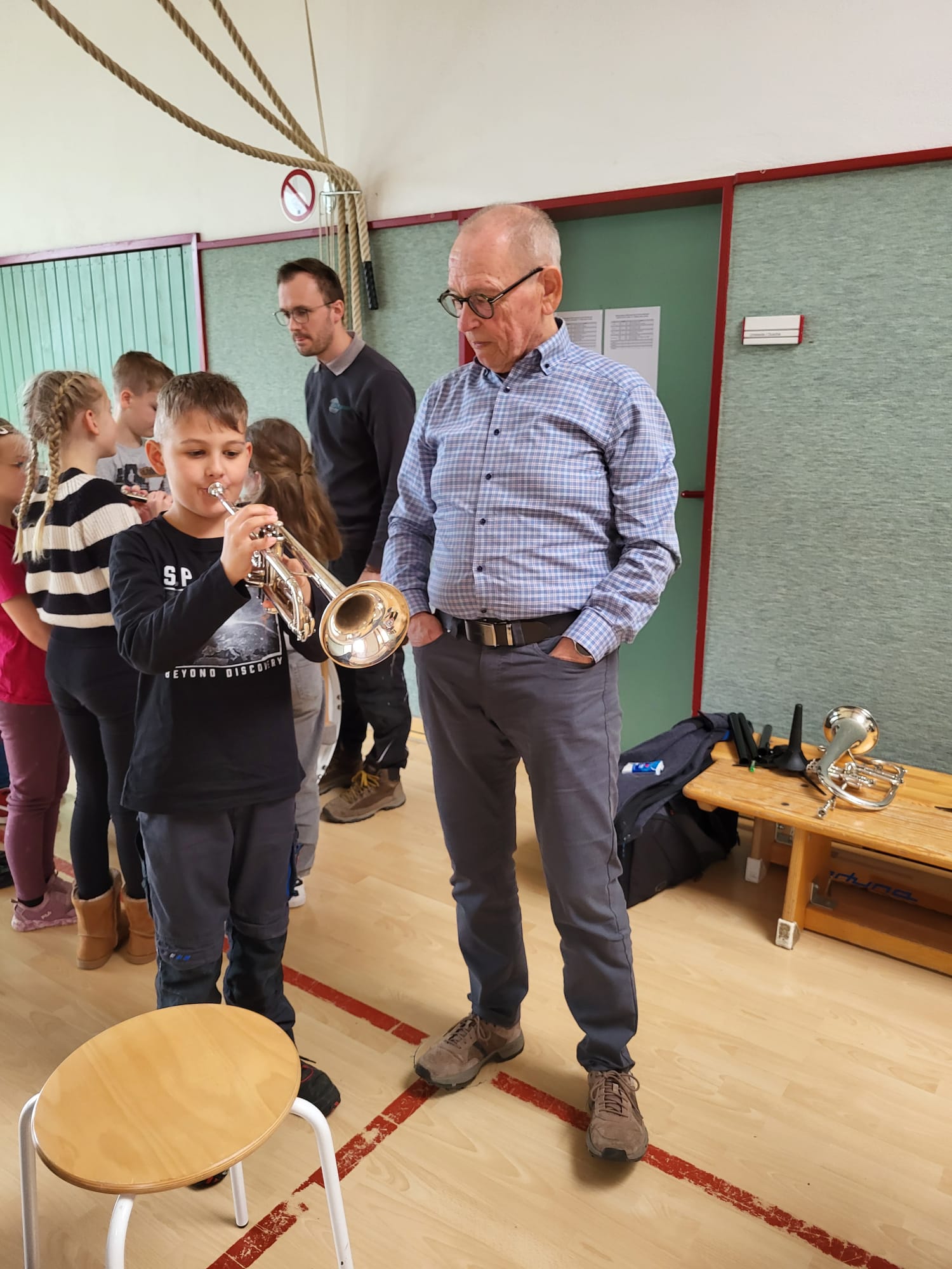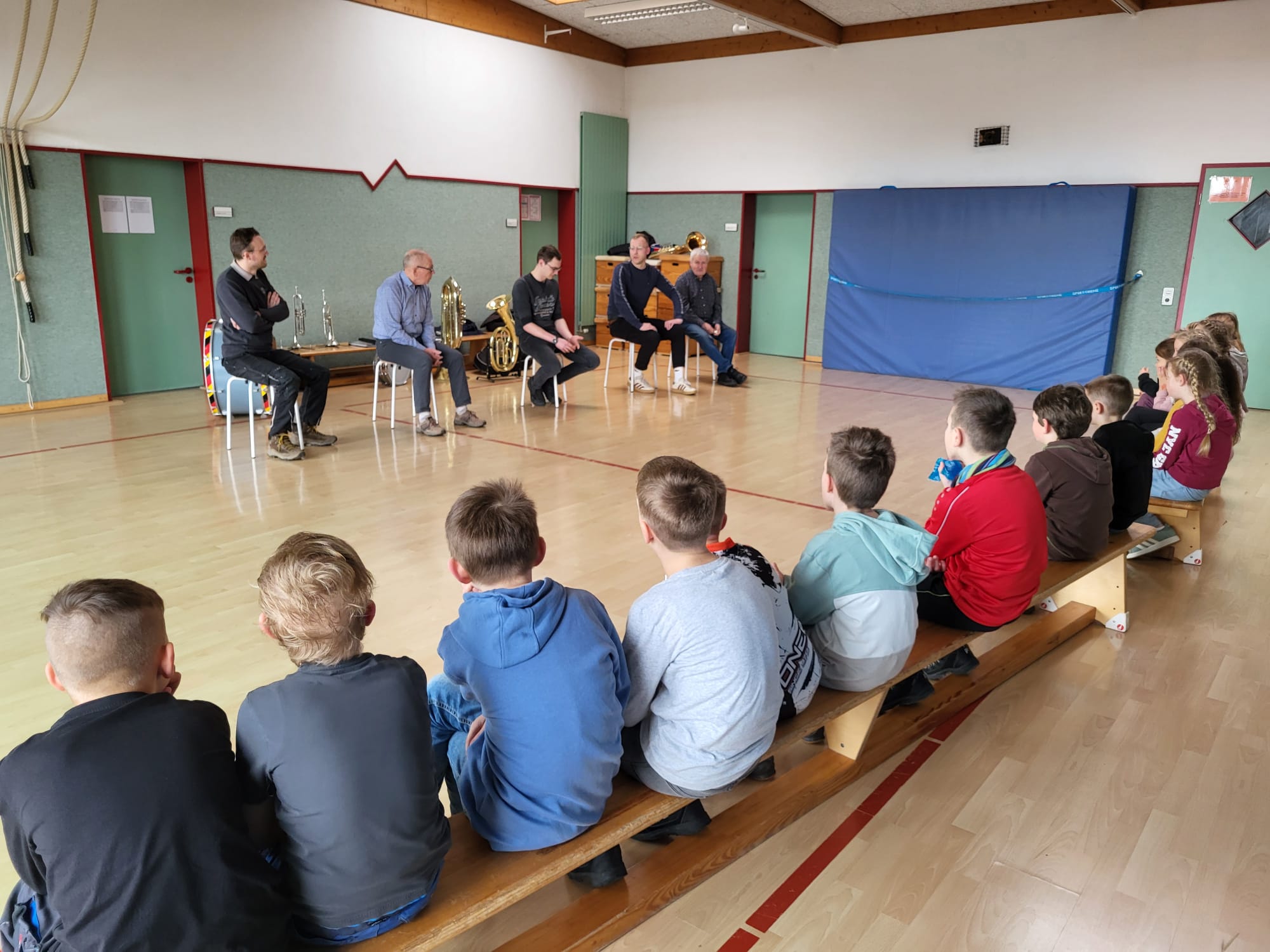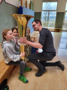 Heute waren Musiker vom Musikverein Schönholthausen und vom Spielmannszug Schönholthausen bei uns in der 3. Klasse zu Besuch. Sie haben uns verschiedene Instrumente vorgestellt und erklärt, wie sie funktionieren.